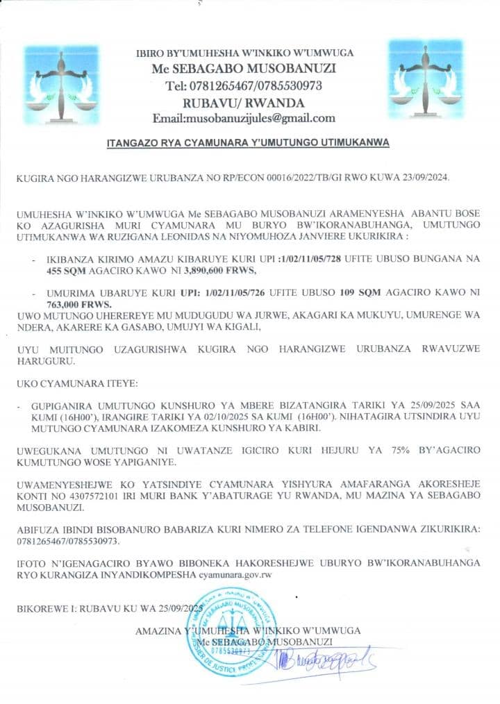 ITANGAZO RYA CYAMUNARA Y'UMUTUNGO UTIMUKANWA UHEREREYE NYAMYUMBA MURI RUBAVU