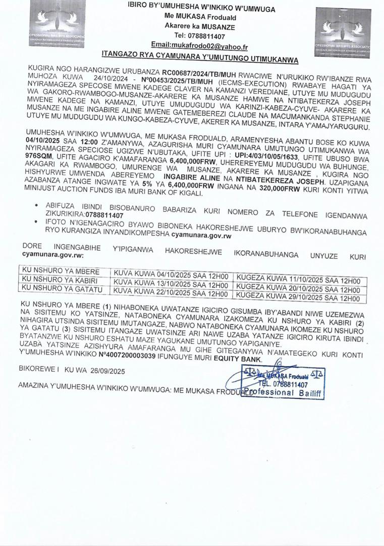 ITANGAZO RYA CYAMUNARA Y’UMUTUNGO UTIMUKANWA UHEREREYE MUSANZE