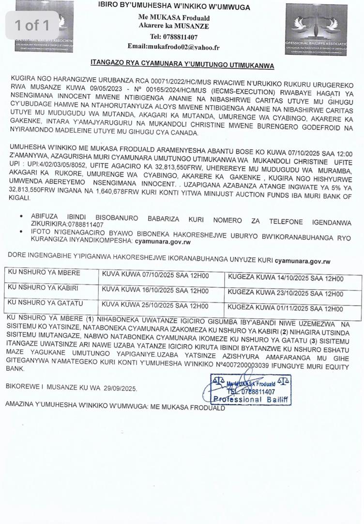 ITANGAZO RYA CYAMUNARA Y'IMITUNGO UTIMUKANWA UHEREREYE NDERA MURI KIGALI
